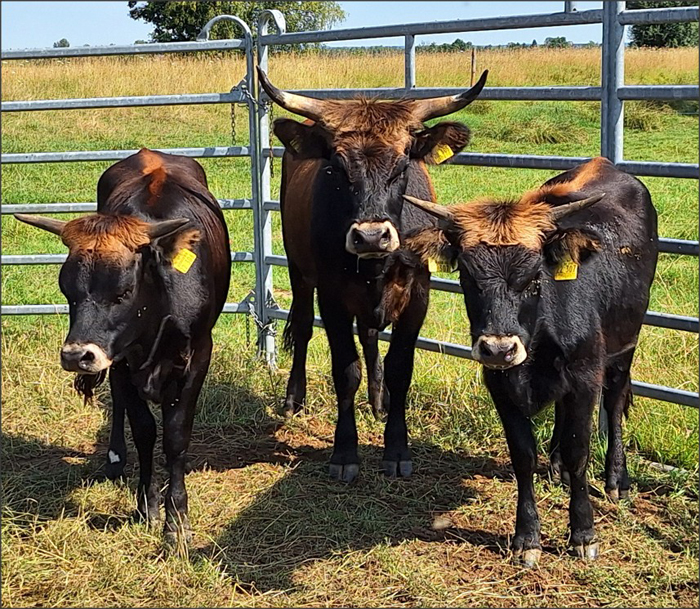 TIERE Unsere "Auerochsen" stehen ausschließlich im Zuchtbuch A des VFA (Verein zur Förderung der Auerochsenzucht e.V.). Wir legen Wert auf inzuchtfreie Tiere; deswegen halten wir unsere "Auerochsen" zeitweise in zwei Herden. Die vorgeschriebenen Blutuntersuchungen zur Tierseuchenbekämpfung sind bereits gemacht oder werden bei Verkauf vorher noch durchgeführt. Preise nach Absprache. Der Transport kann von uns übernommen werden. Alle Tiere sind Bio zertifiziert.